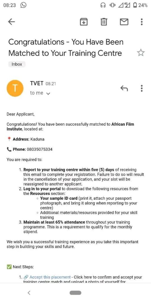 The FME TVET has started sending approval emails and matching trainees to training centers. The process is slow at the moment. All you have to do is to be patient and keep checking your email address and your TVET application dashboard on https://www.tvet.education.gov.ng/login